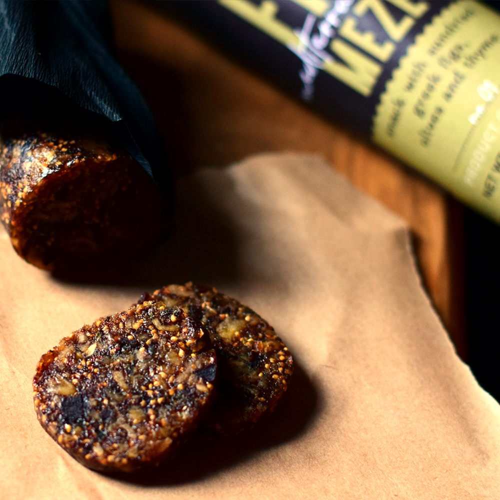 FIG MEZE MEDITERRANEAN tar oss med sin jordnära smak med på en kulinarisk resa till Medelhavets underbara skatter – i varje tugga. En skiva fikonmeze döljer det utsökta grekiska fikonet, kombinerat med timjan från dess berg och de berömda svarta Kalamataoliverna. Kvartetten fulländas med balsamvinäger från Peloponnesos vingårdar.