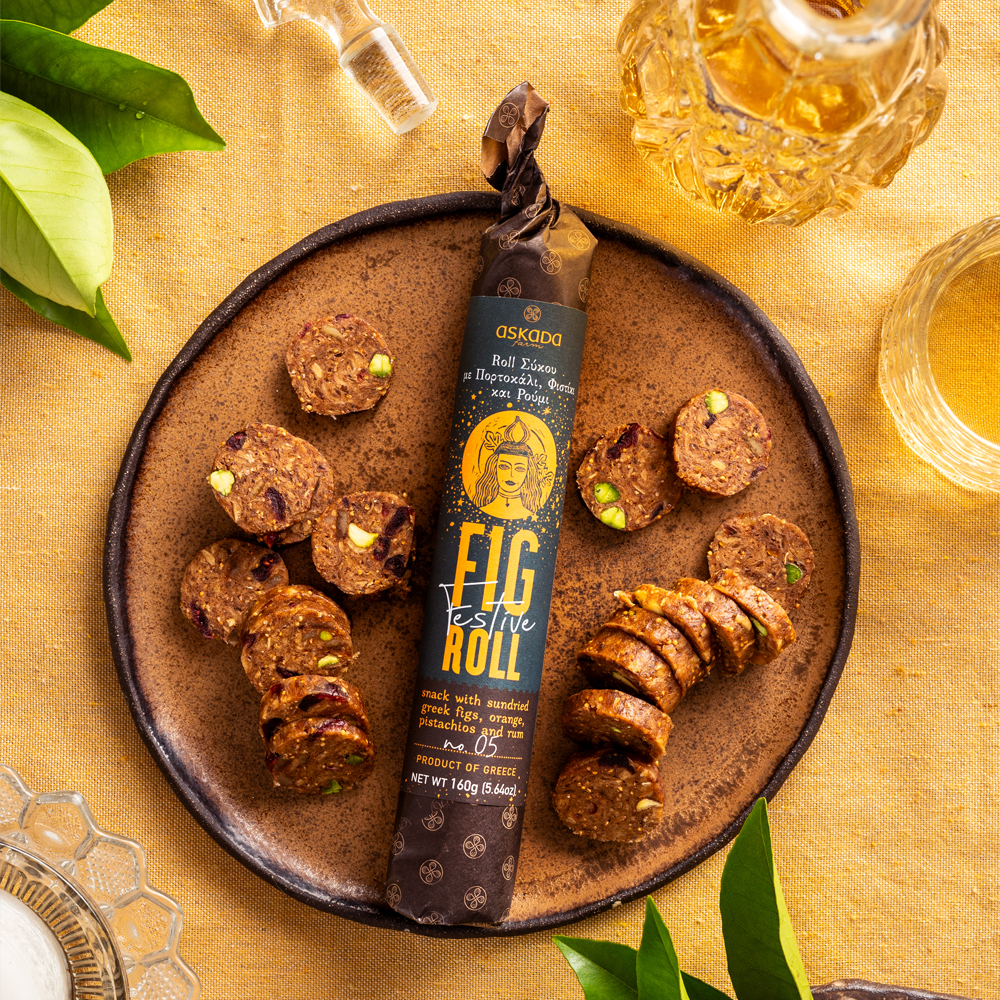 FIG ROLL Festive – en spännande blandning av njutbara smaker, perfekt för att fira speciella stunder! Torkade fikon från Kymi, med sin naturliga sötma, kombineras på ett fantastiskt sätt med den friska smaken av kanderat apelsinskal, den krispiga känslan från pistagenötter från Aigina och den lätt syrliga smaken från tranbär. En touch av rom tillför en diskret värme och en fyllig, lätt kryddig eftersmak.